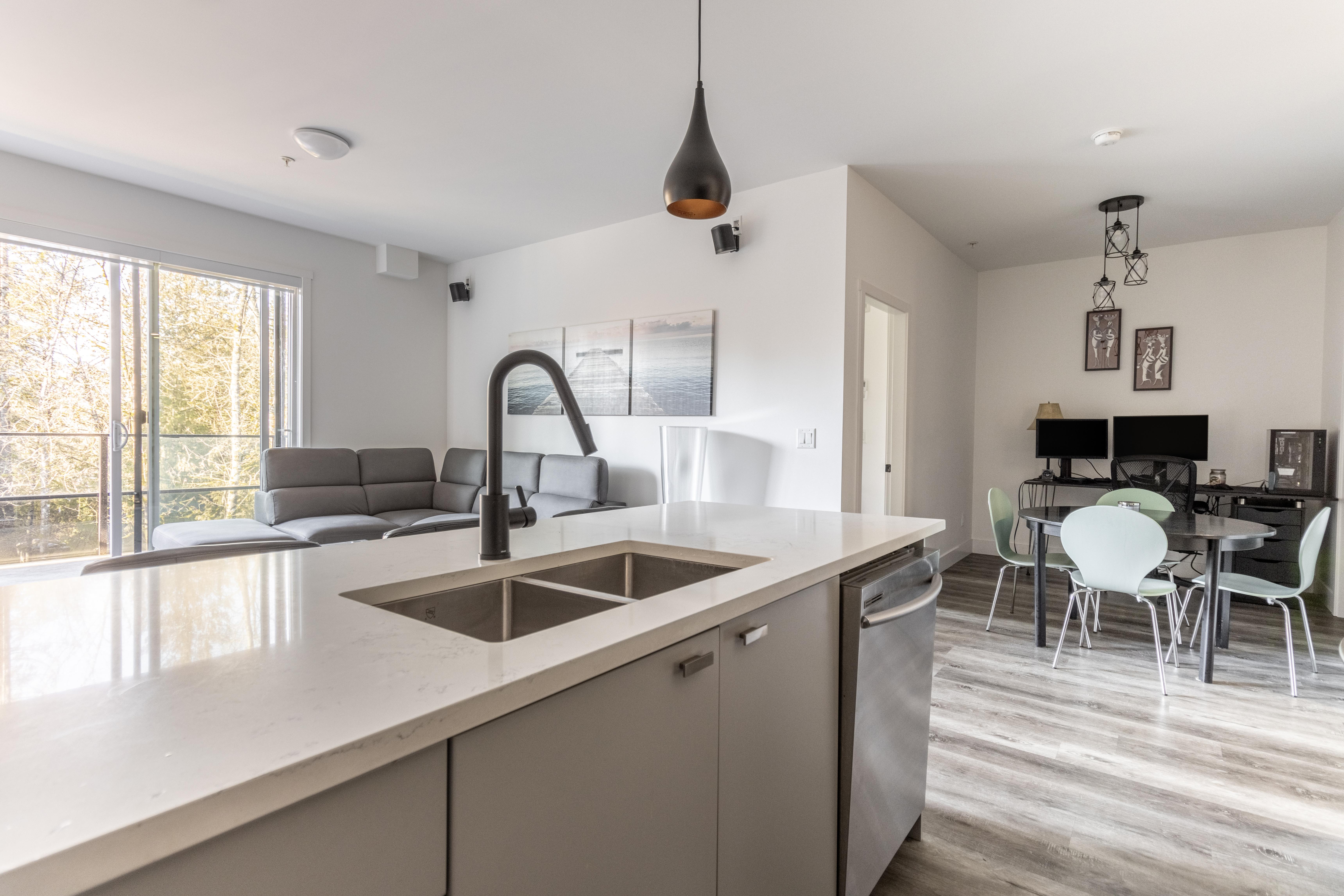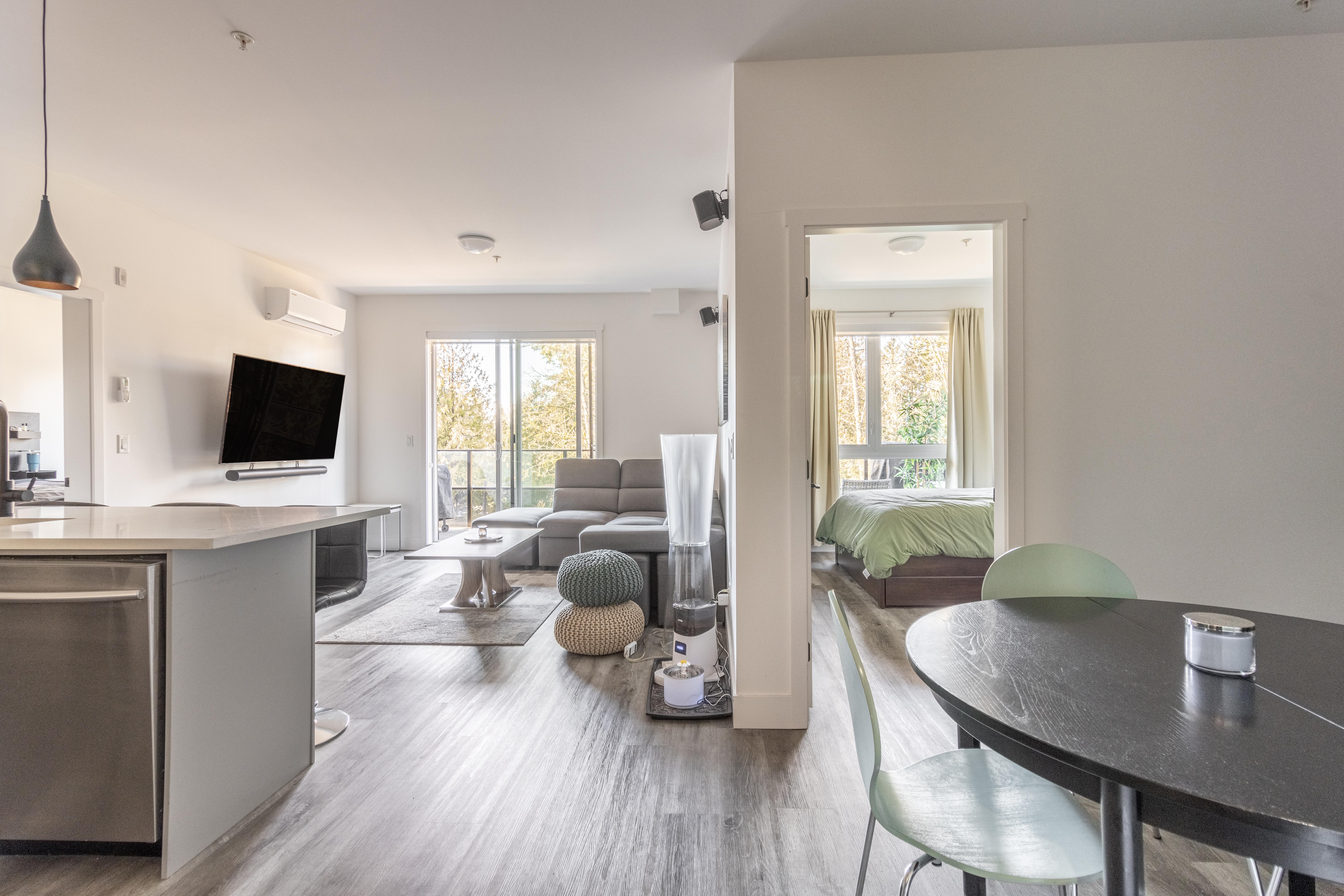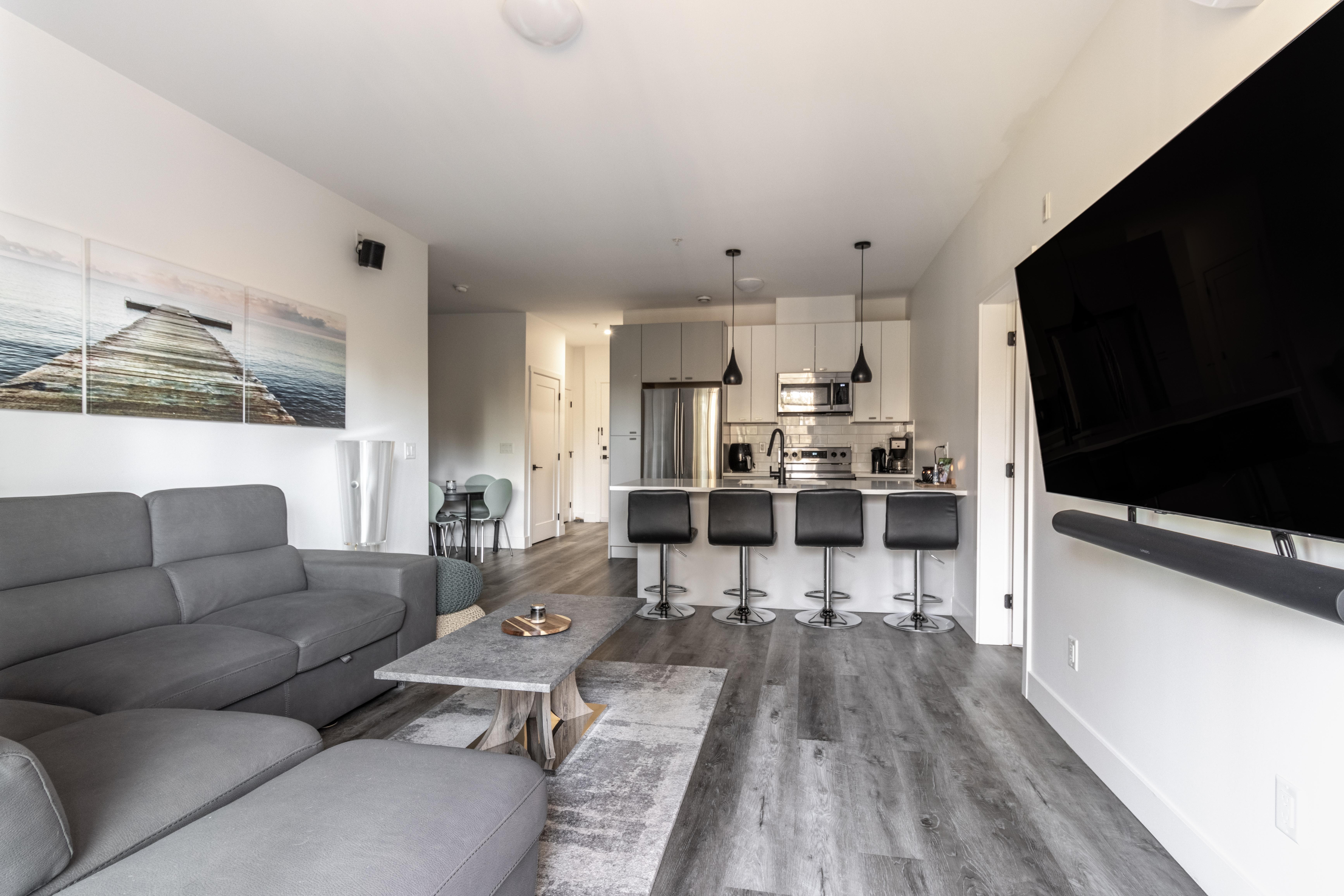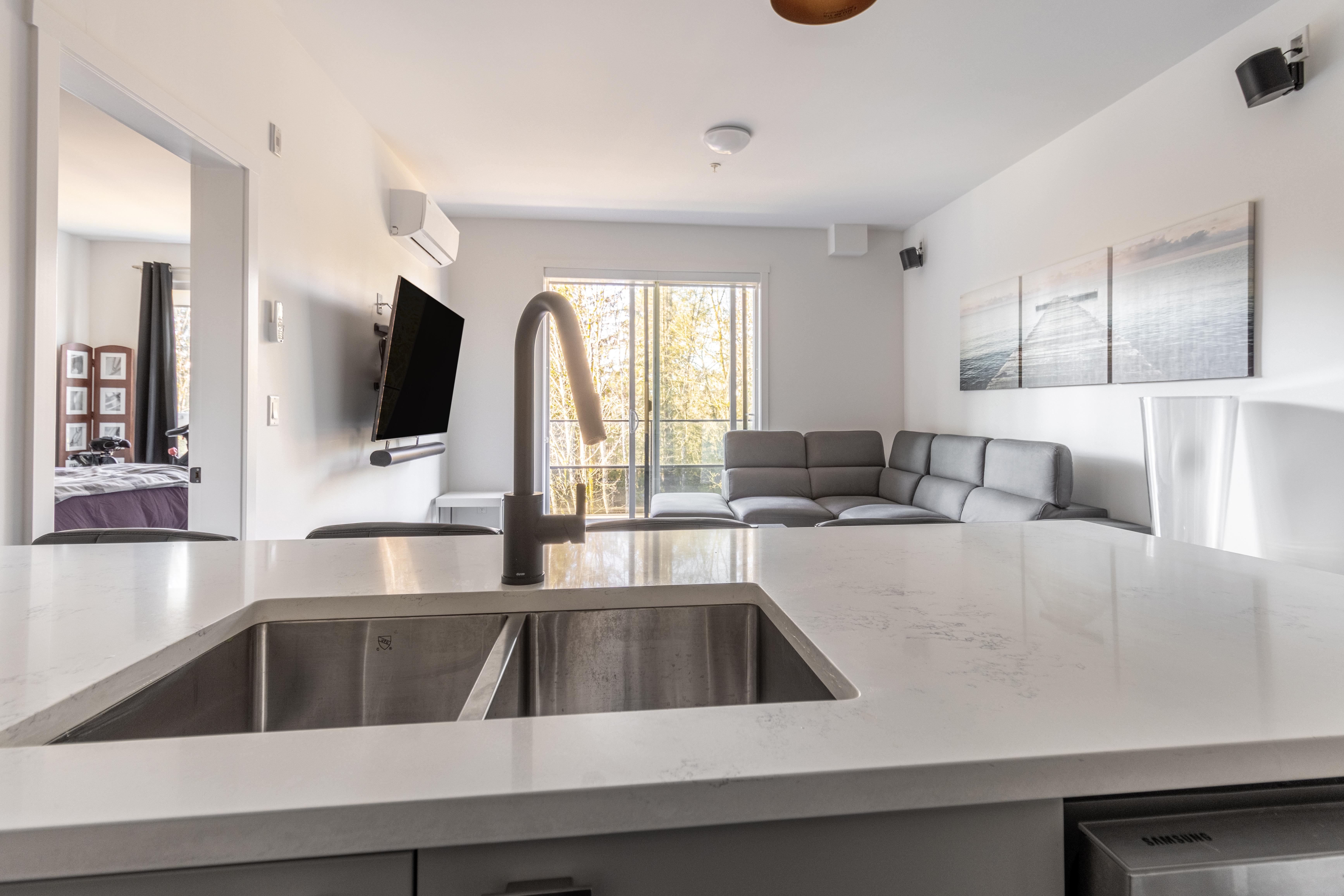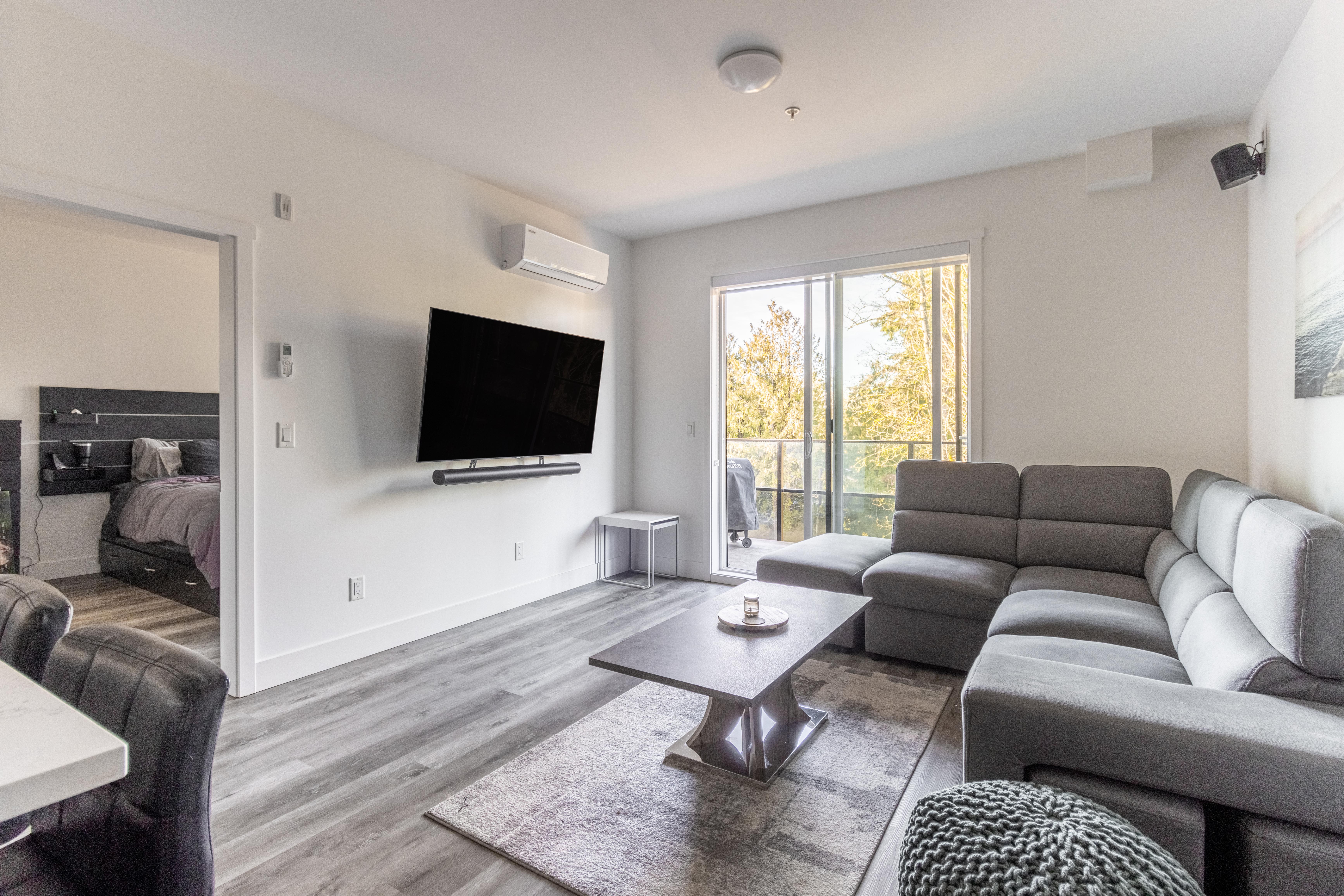 Penthouse living at it's finest! This spacious 1,039sqft 2 bedroom and den, 2 bathroom condo features 12ft vaulted ceilings, open concept living room, modern style kitchen with a breakfast bar, large master bedroom with a full sized walk-in closet and ensuite washroom, as well as a den that is perfect for your home office and a covered balcony to enjoy the outside rain or shine. The unit is equipped with air conditioning in every room to keep you cool on those hot summer days and heat pump will make sure you're nice and toasty on those cold winter days. Built in 2020, it still has the balance of the 5-10 building warranty to give you peace of mind. It is situated at the end of a quiet street surrounded by greenery, shops, cafes and restaurants close by. Come take a look and see what this amazing unit has to offer!