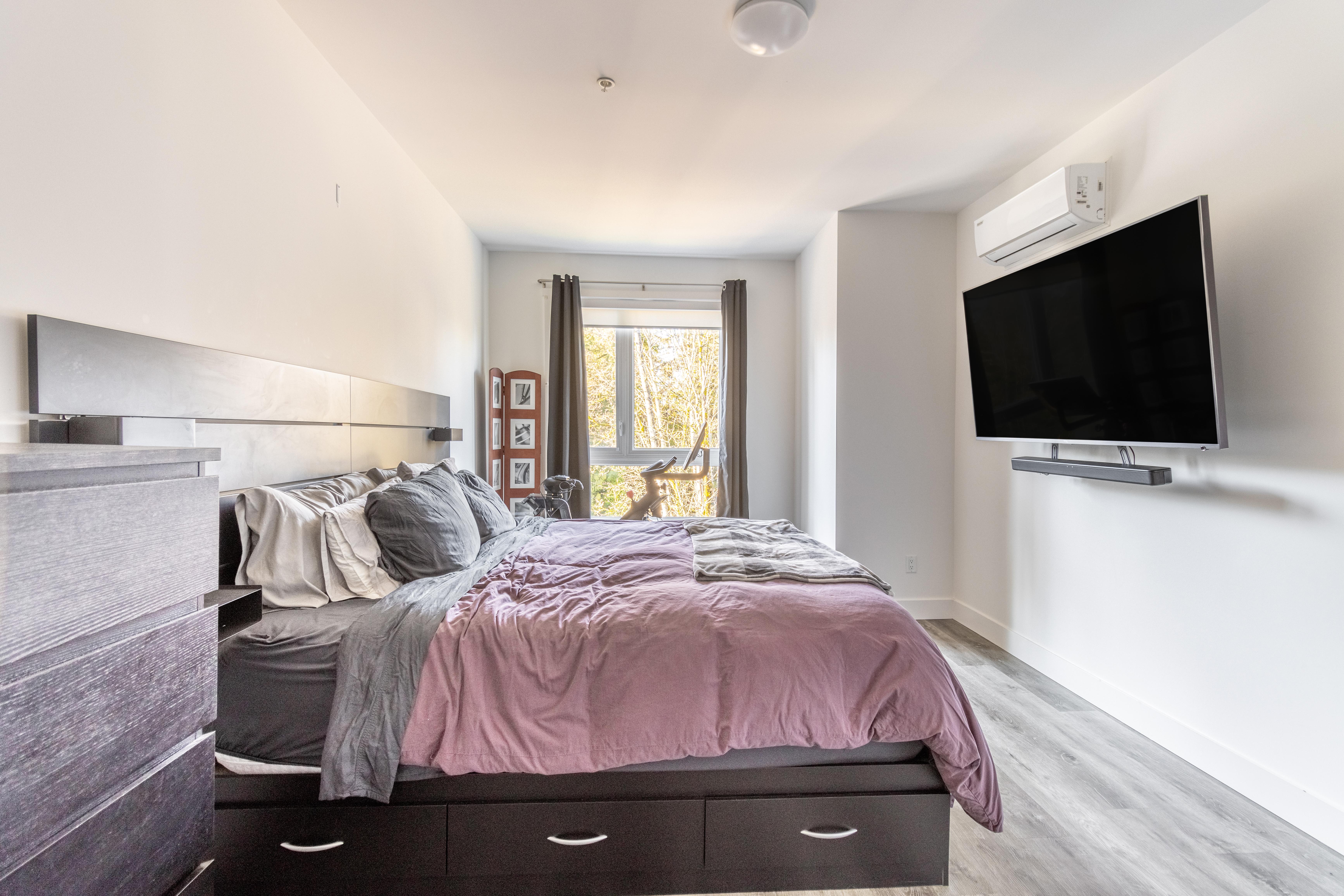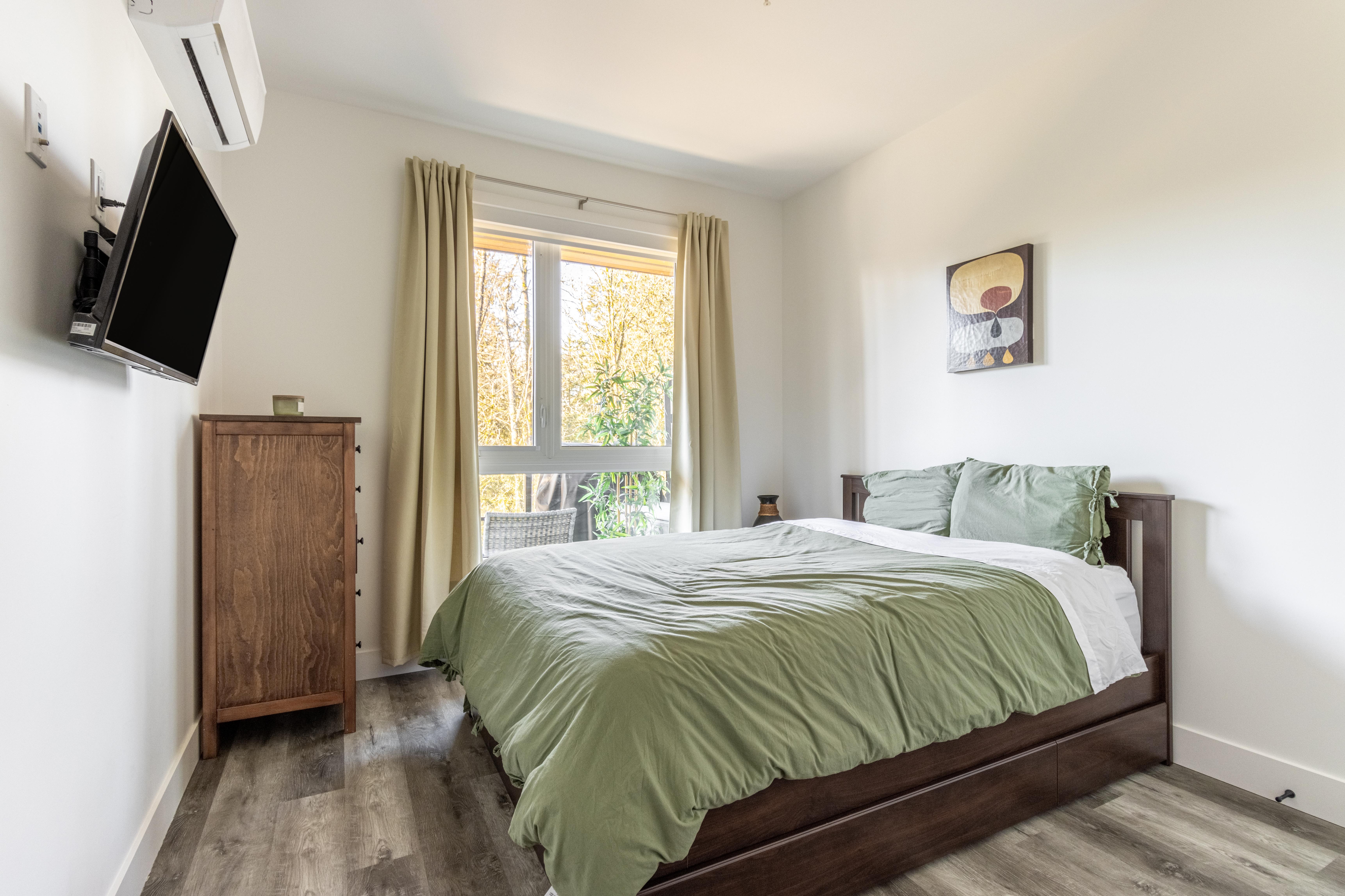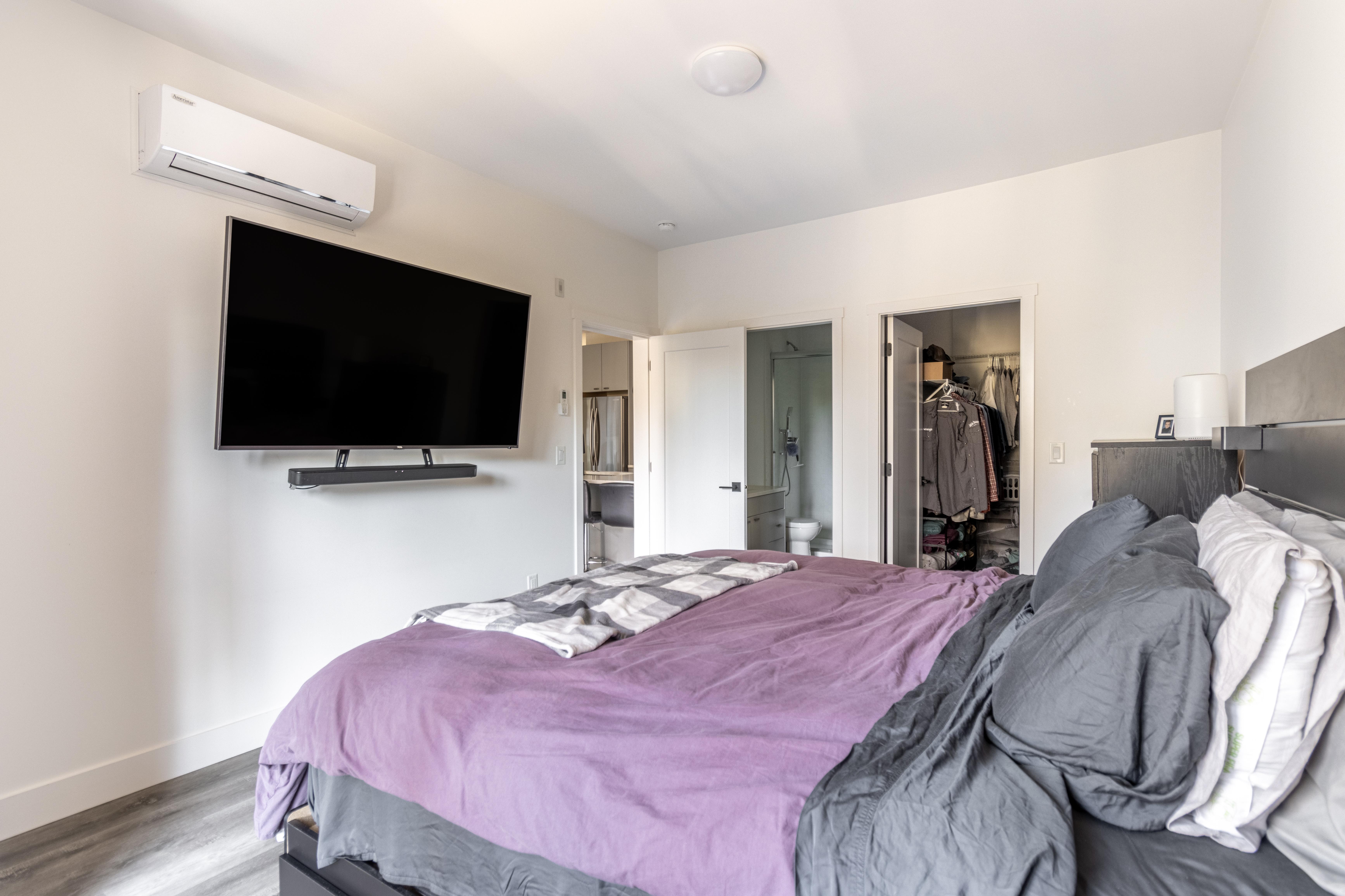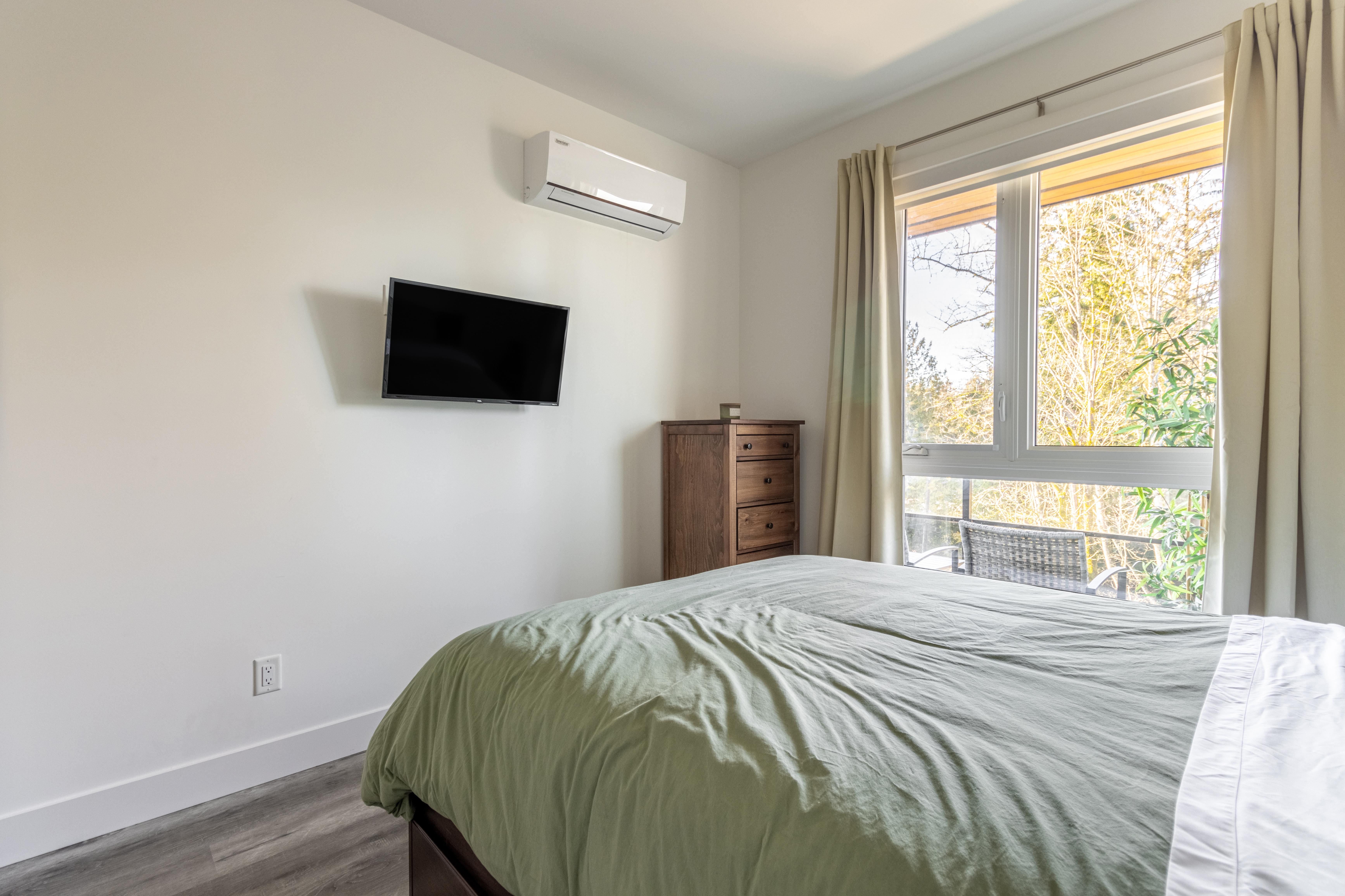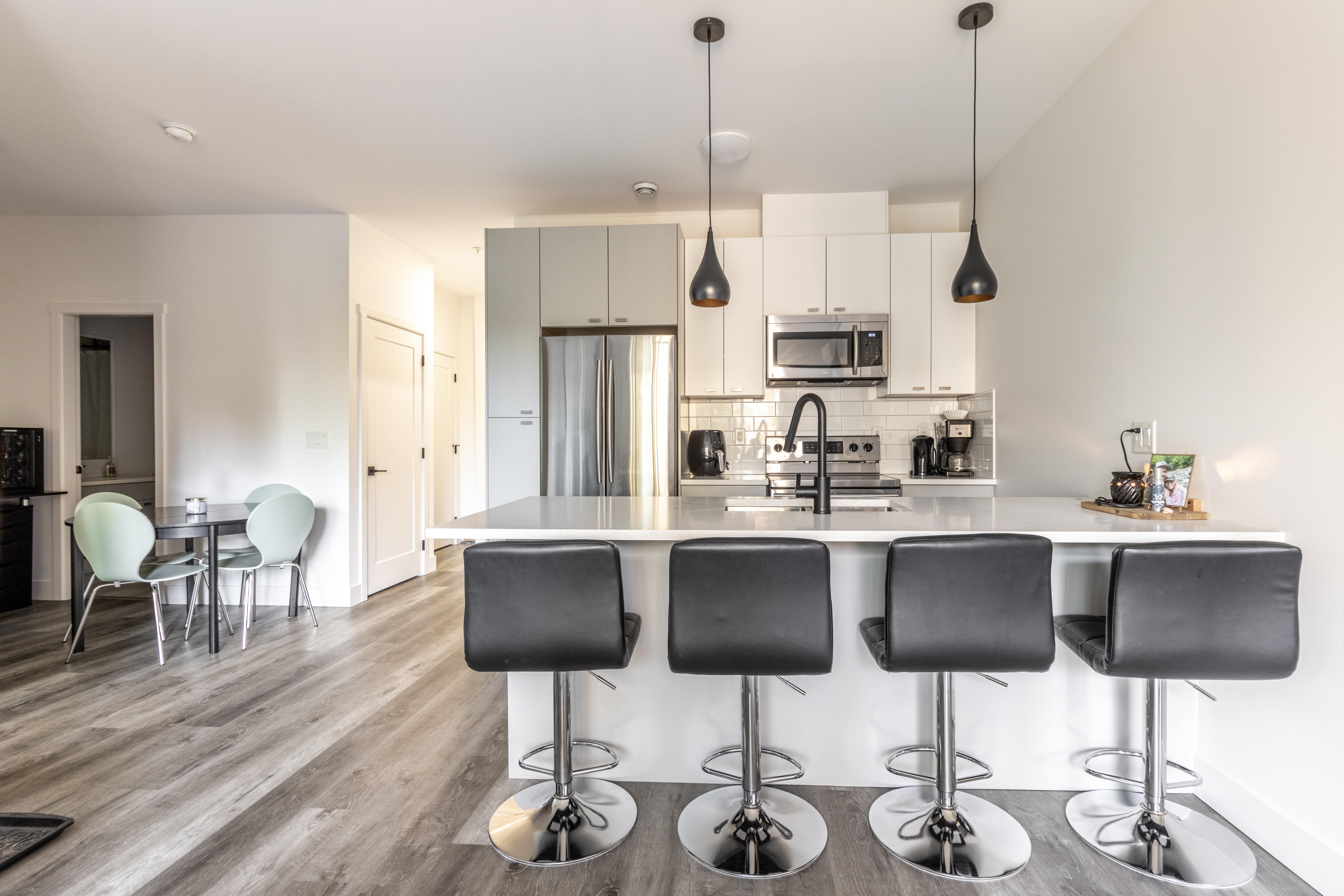 Penthouse living at it's finest! This spacious 1,039sqft 2 bedroom and den, 2 bathroom condo features 12ft vaulted ceilings, open concept living room, modern style kitchen with a breakfast bar, large master bedroom with a full sized walk-in closet and ensuite washroom, as well as a den that is perfect for your home office and a covered balcony to enjoy the outside rain or shine. The unit is equipped with air conditioning in every room to keep you cool on those hot summer days and heat pump will make sure you're nice and toasty on those cold winter days. Built in 2020, it still has the balance of the 5-10 building warranty to give you peace of mind. It is situated at the end of a quiet street surrounded by greenery, shops, cafes and restaurants close by. Come take a look and see what this amazing unit has to offer!