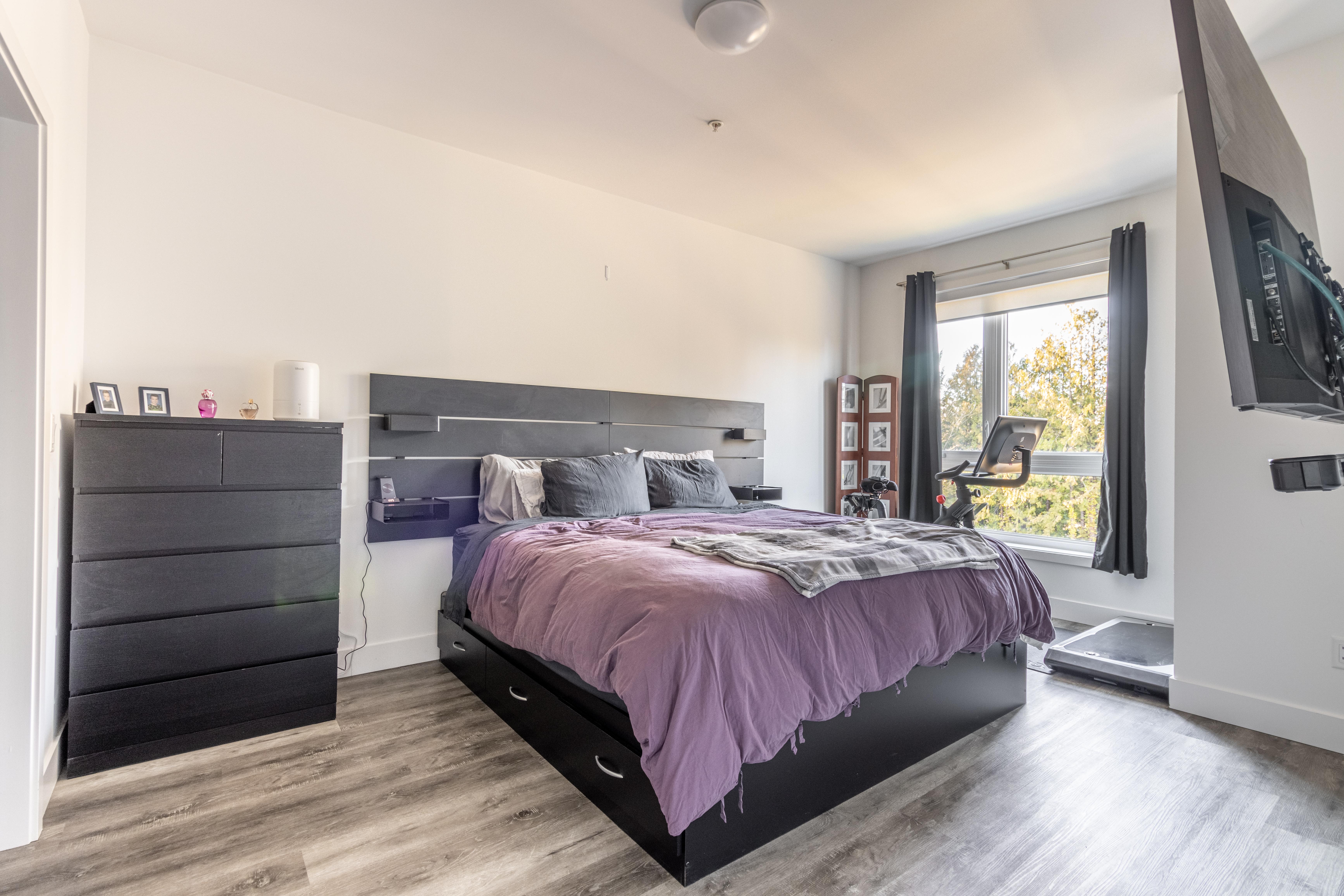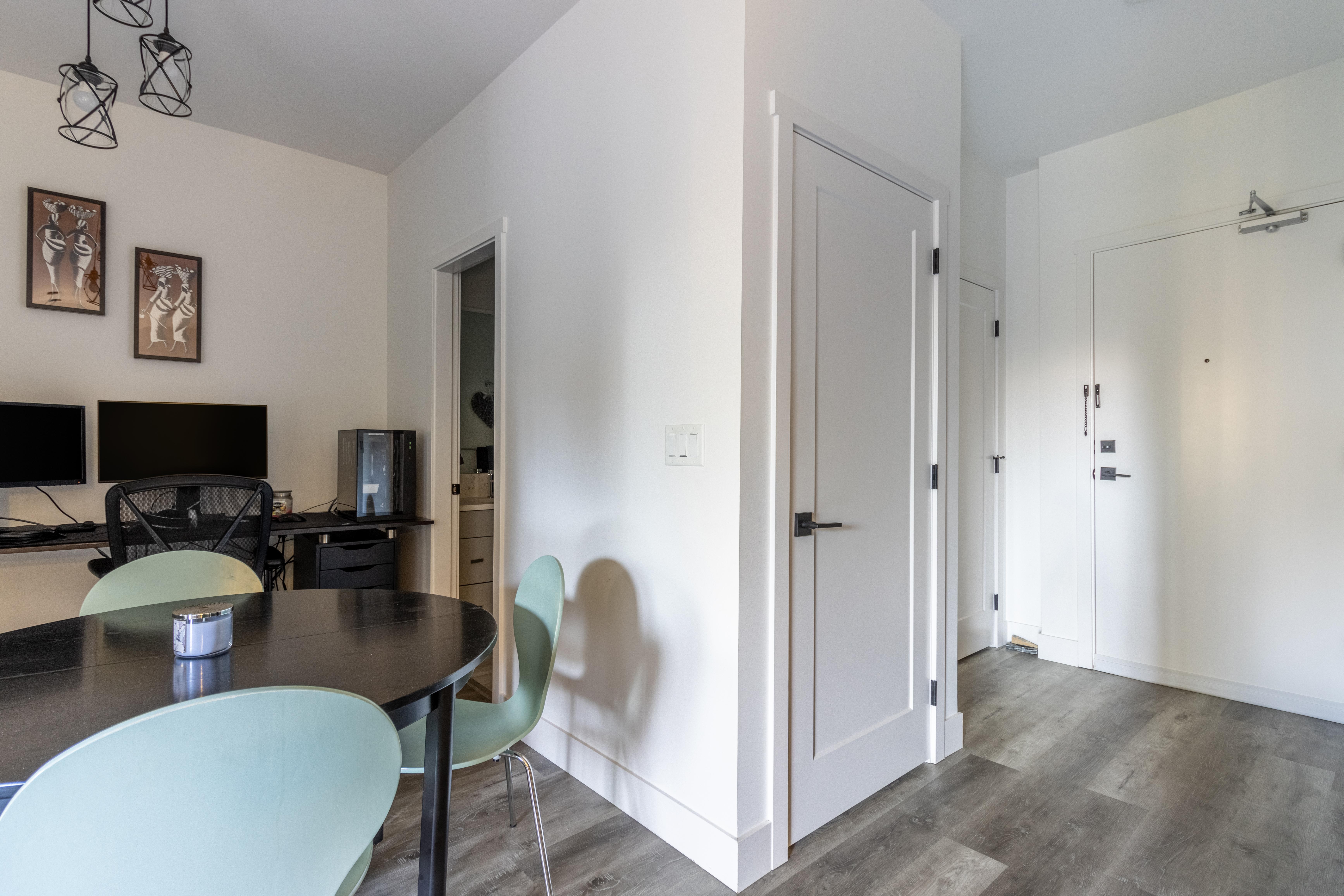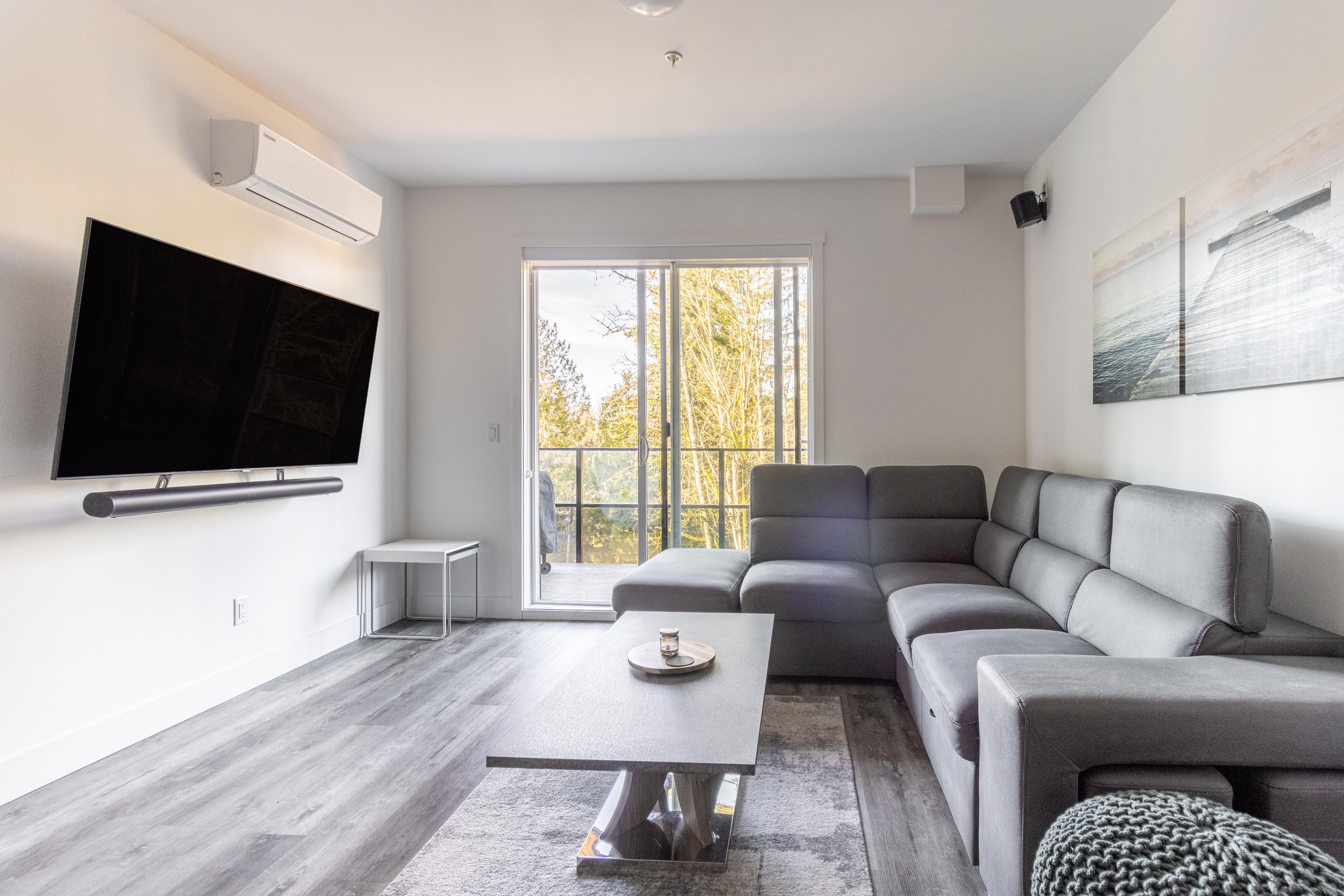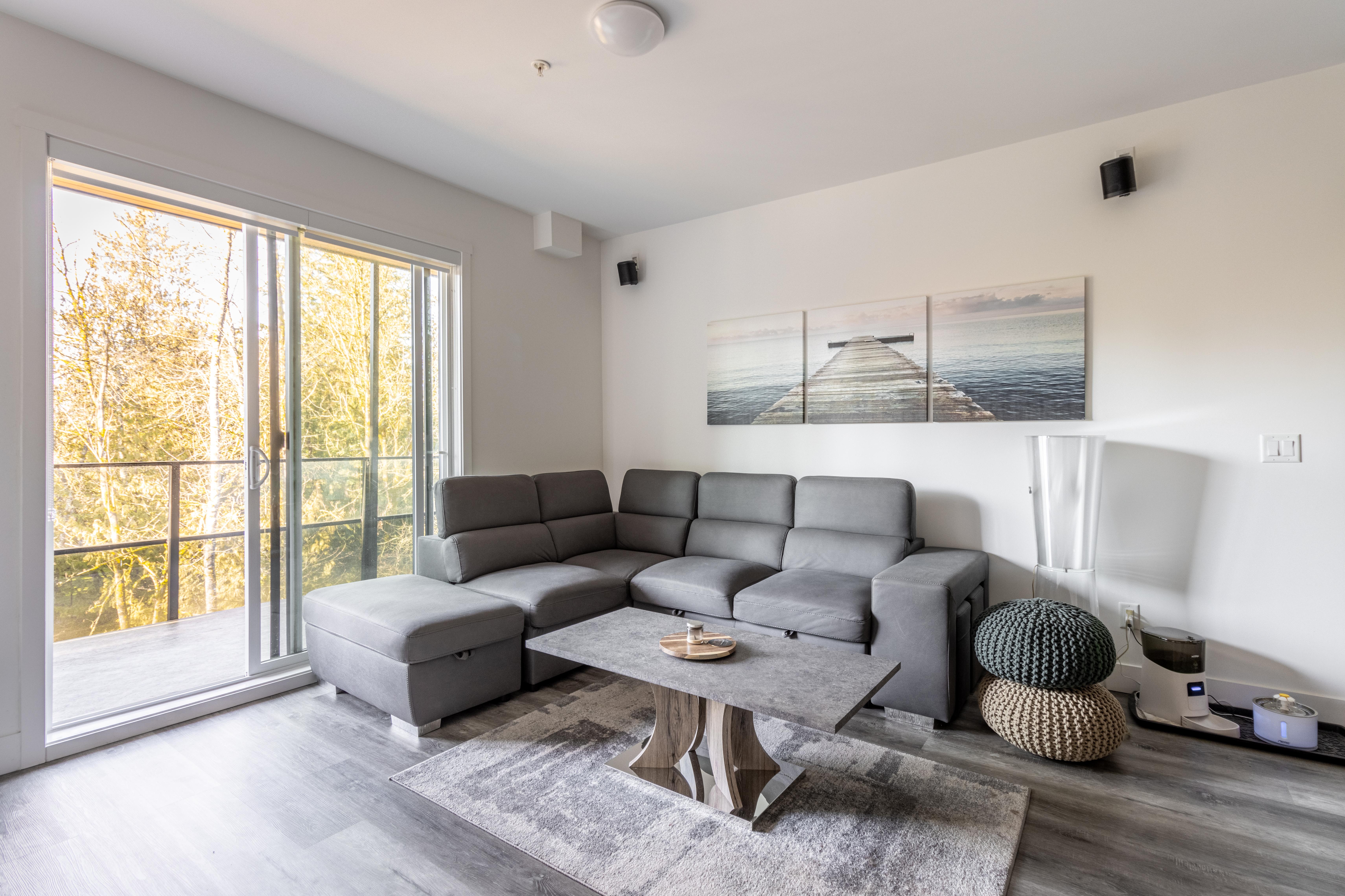 Penthouse living at it's finest! This spacious 1,039sqft 2 bedroom and den, 2 bathroom condo features 12ft vaulted ceilings, open concept living room, modern style kitchen with a breakfast bar, large master bedroom with a full sized walk-in closet and ensuite washroom, as well as a den that is perfect for your home office and a covered balcony to enjoy the outside rain or shine. The unit is equipped with air conditioning in every room to keep you cool on those hot summer days and heat pump will make sure you're nice and toasty on those cold winter days. Built in 2020, it still has the balance of the 5-10 building warranty to give you peace of mind. It is situated at the end of a quiet street surrounded by greenery, shops, cafes and restaurants close by. Come take a look and see what this amazing unit has to offer!
