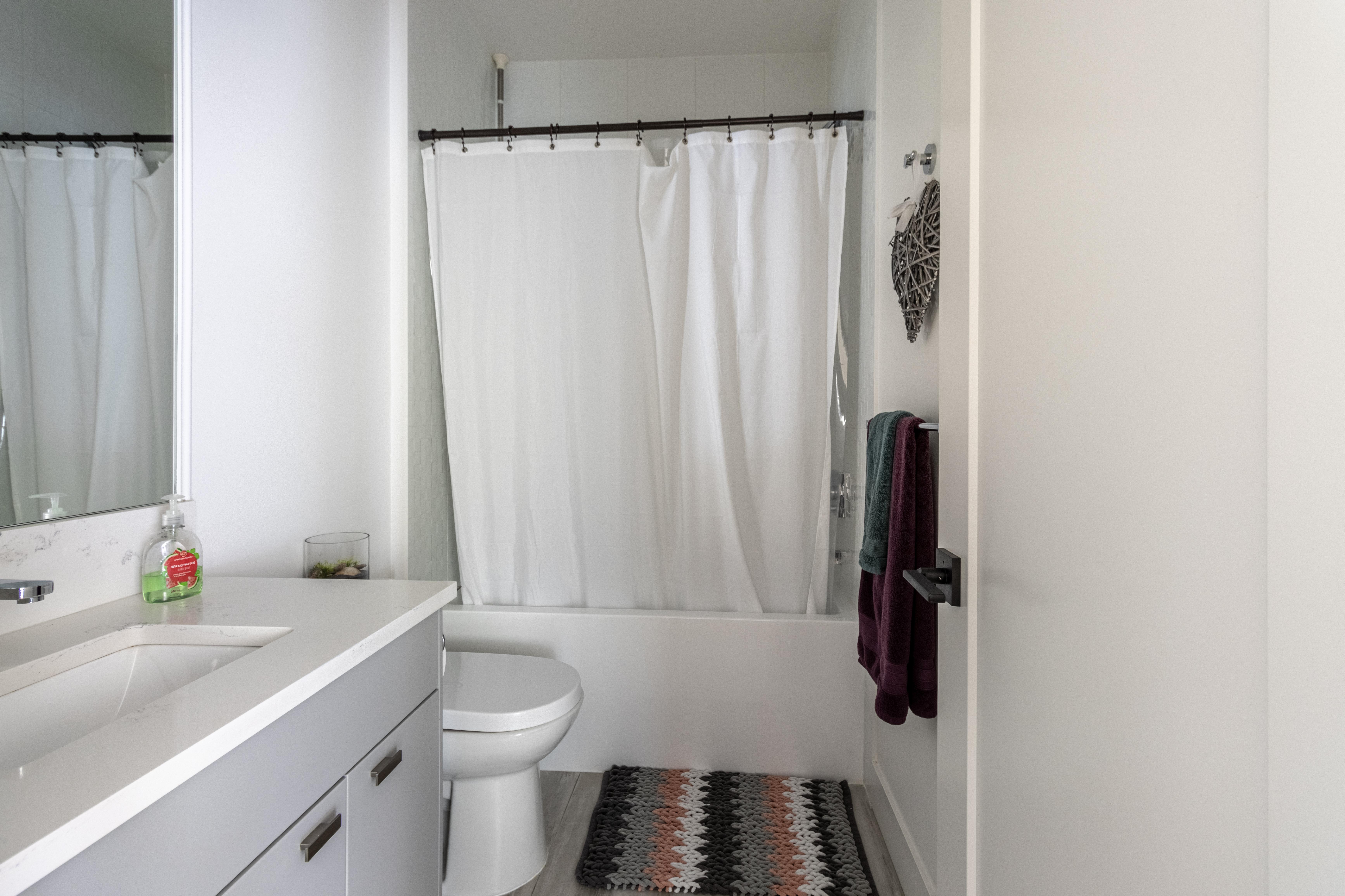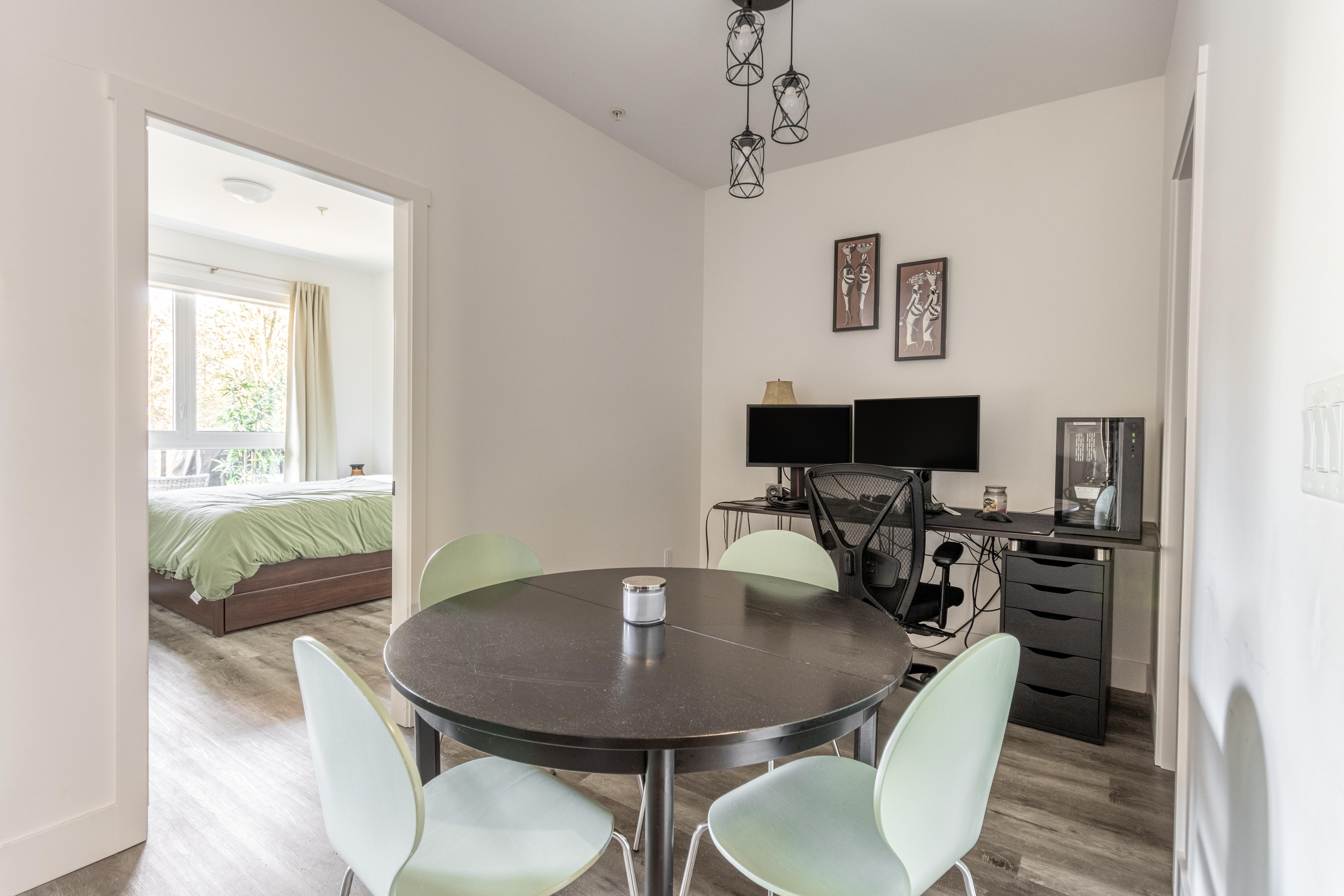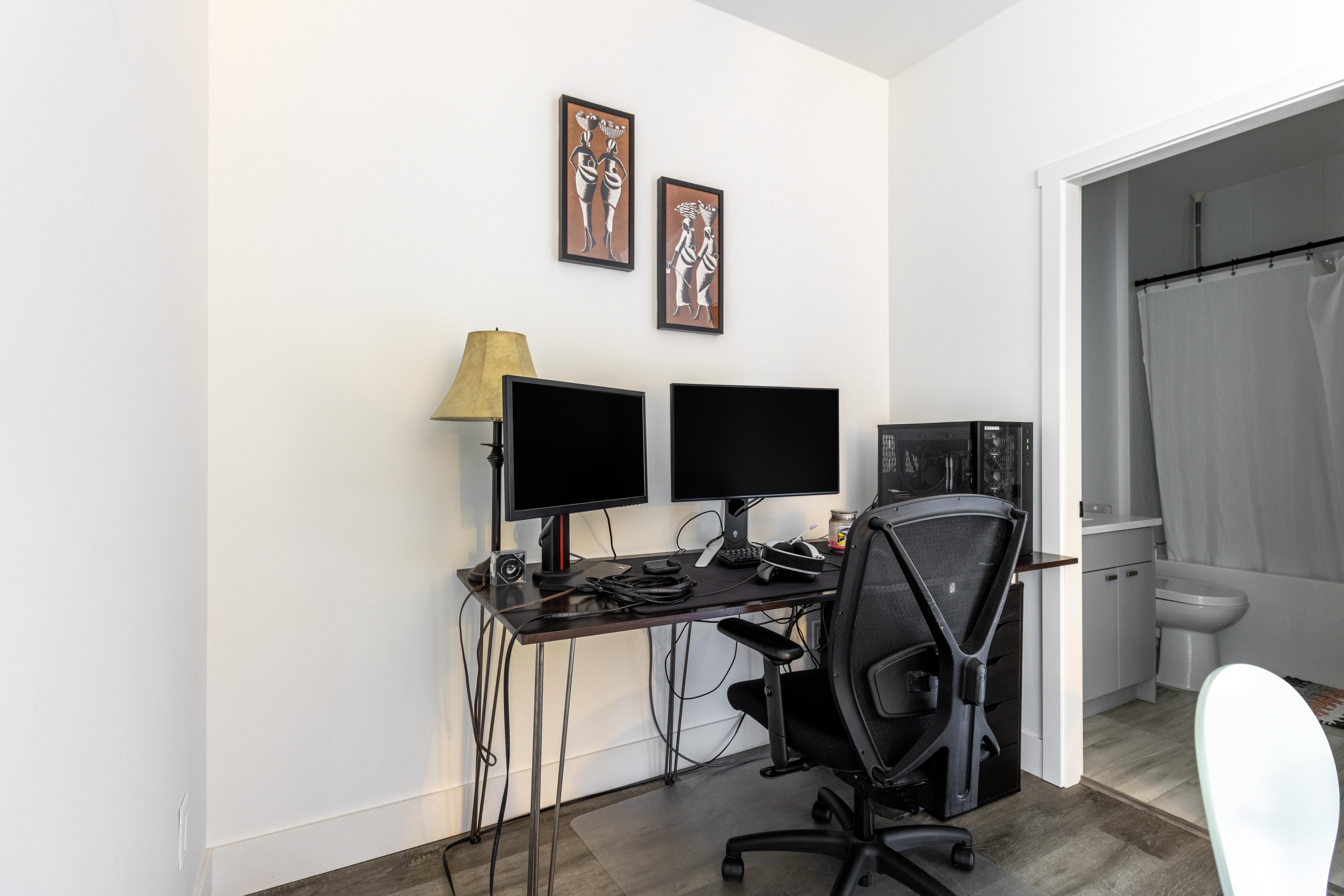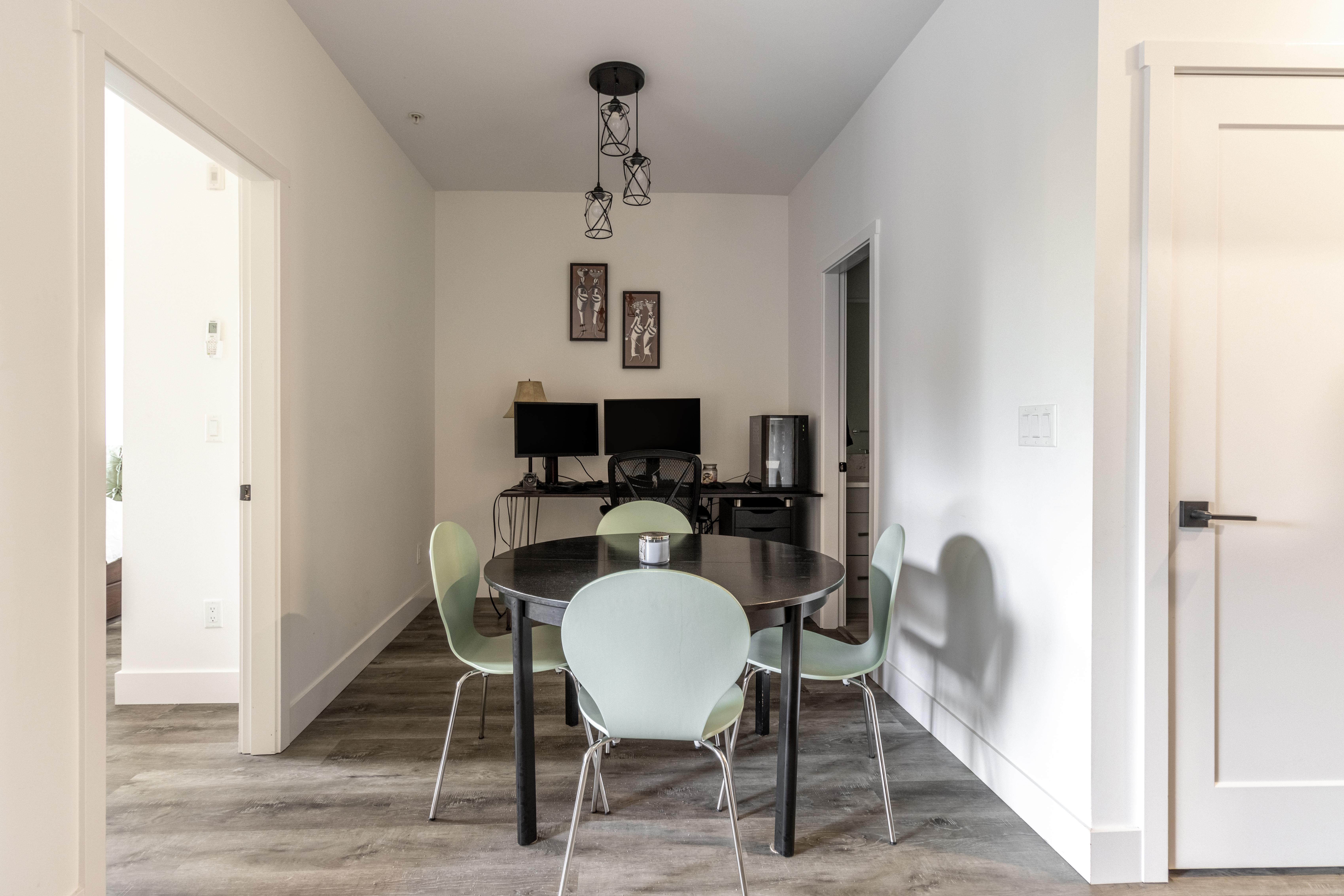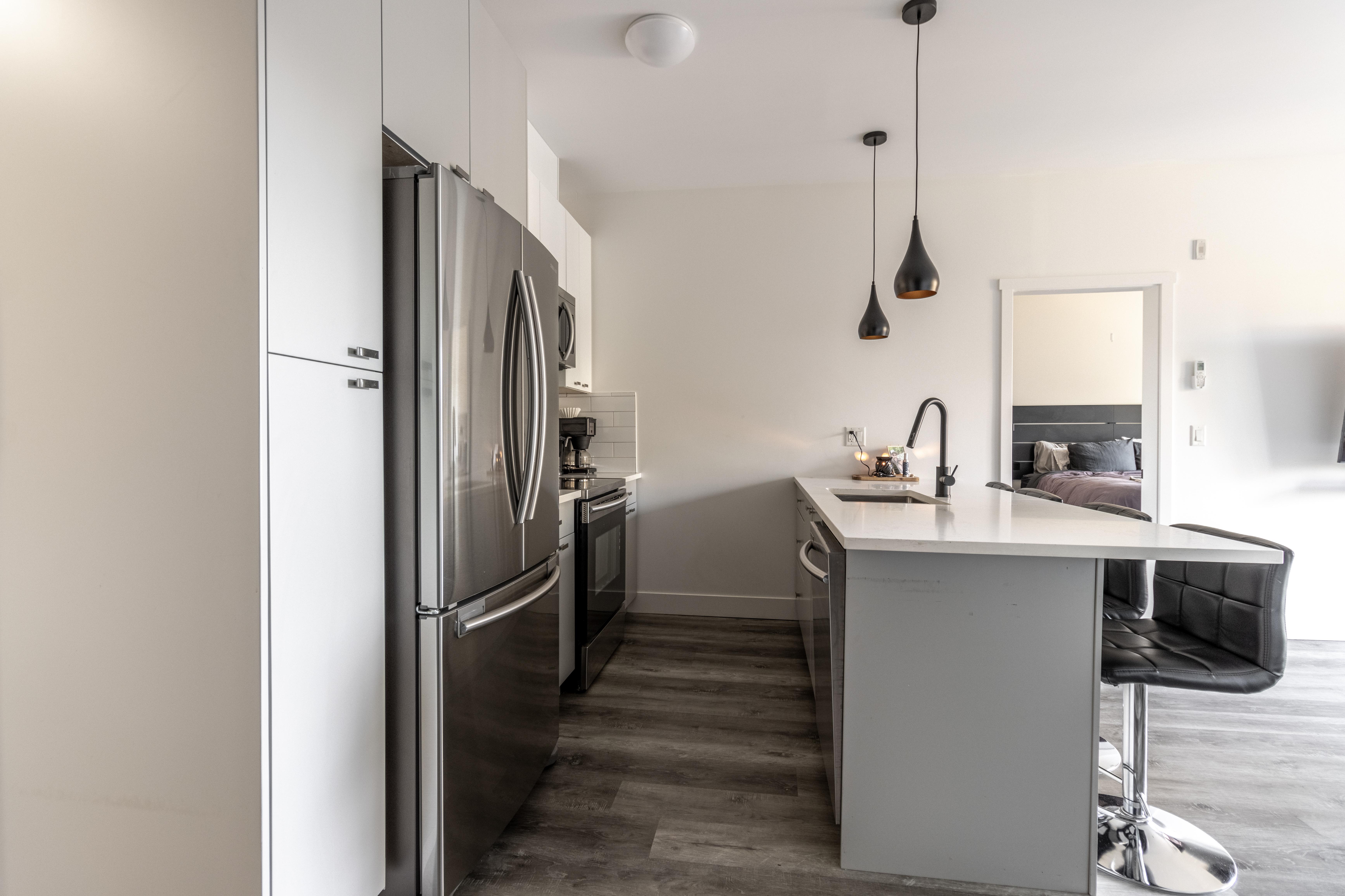 Penthouse living at it's finest! This spacious 1,039sqft 2 bedroom and den, 2 bathroom condo features 12ft vaulted ceilings, open concept living room, modern style kitchen with a breakfast bar, large master bedroom with a full sized walk-in closet and ensuite washroom, as well as a den that is perfect for your home office and a covered balcony to enjoy the outside rain or shine. The unit is equipped with air conditioning in every room to keep you cool on those hot summer days and heat pump will make sure you're nice and toasty on those cold winter days. Built in 2020, it still has the balance of the 5-10 building warranty to give you peace of mind. It is situated at the end of a quiet street surrounded by greenery, shops, cafes and restaurants close by. Come take a look and see what this amazing unit has to offer!