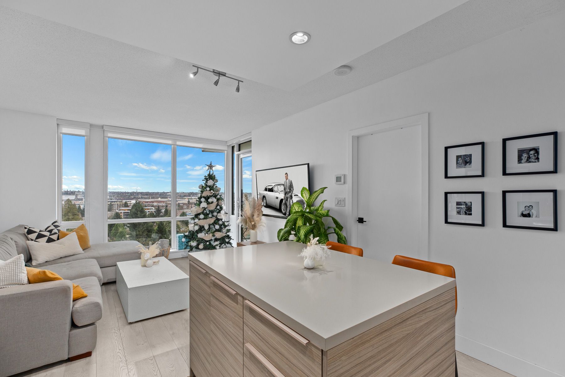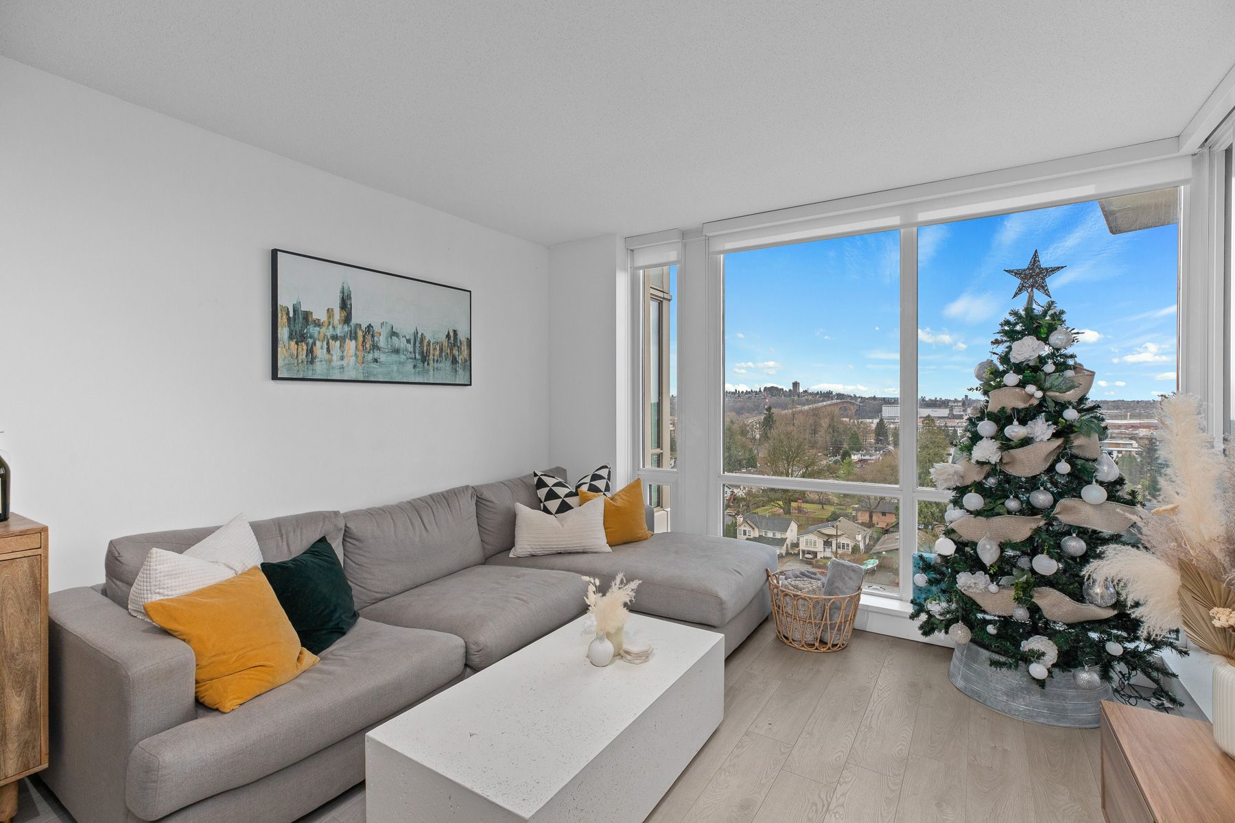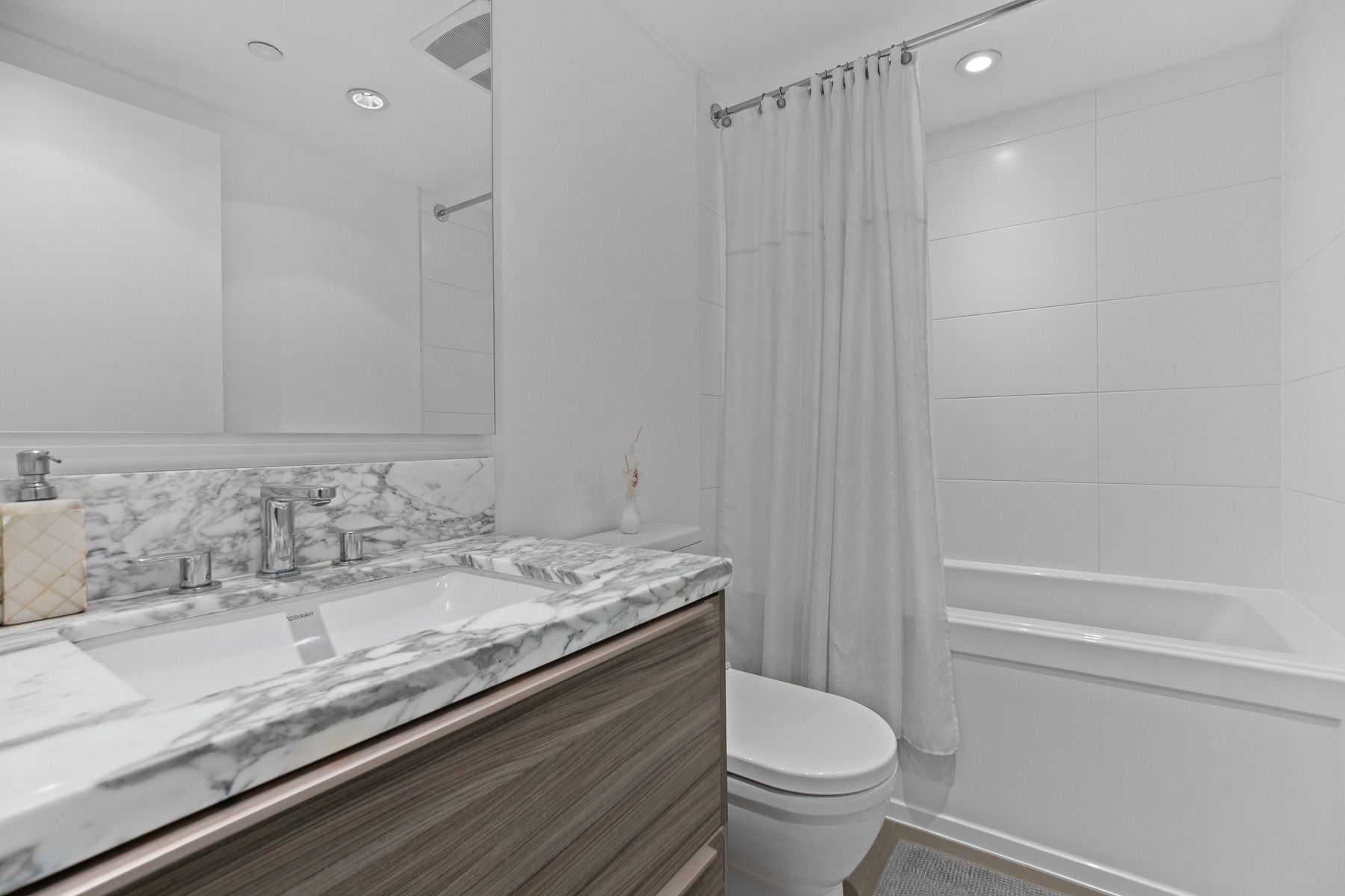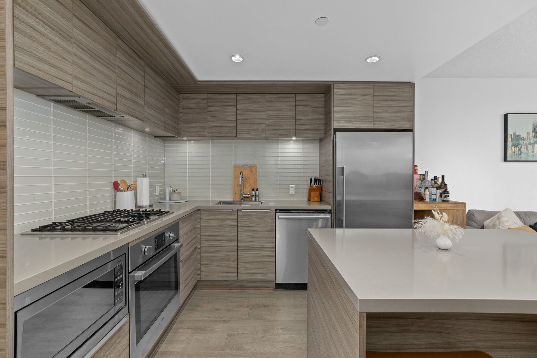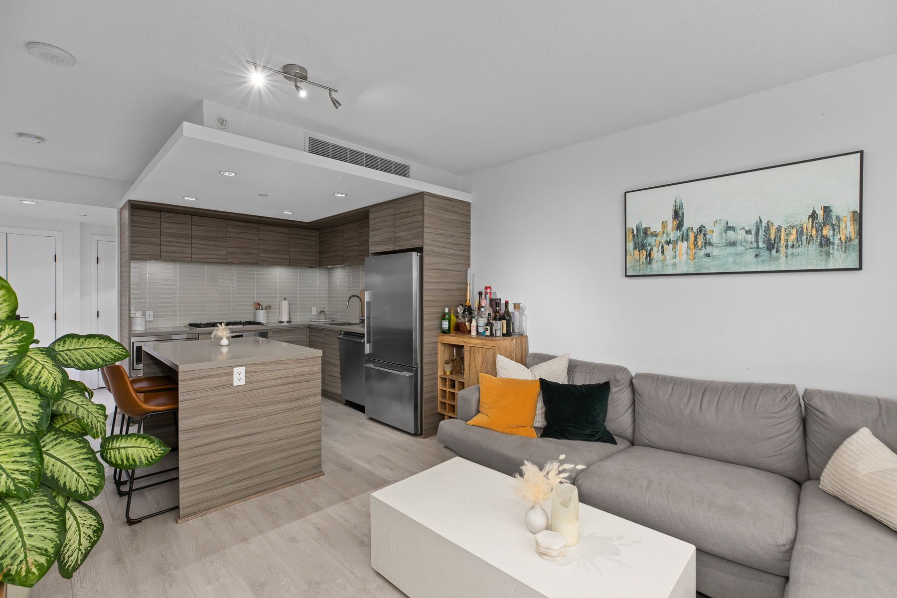 Step into this beautiful 1 bedroom and den, 1 bathroom 619sqft corner unit with city and mountain views! This spacious condo offers an open concept living space, plenty of cabinet storage and a spa-like bathroom. Enjoy high end finishes including stainless steel kitchen appliances, quartz countertops, floor to ceiling triple ply windows and new laminate flooring. Amazing 13,000sqft amenities centre that includes: health and fitness facility, 25M lap pool, lounge with a kitchen, spa, yoga, dance studio, sauna, steam room and guest suite.