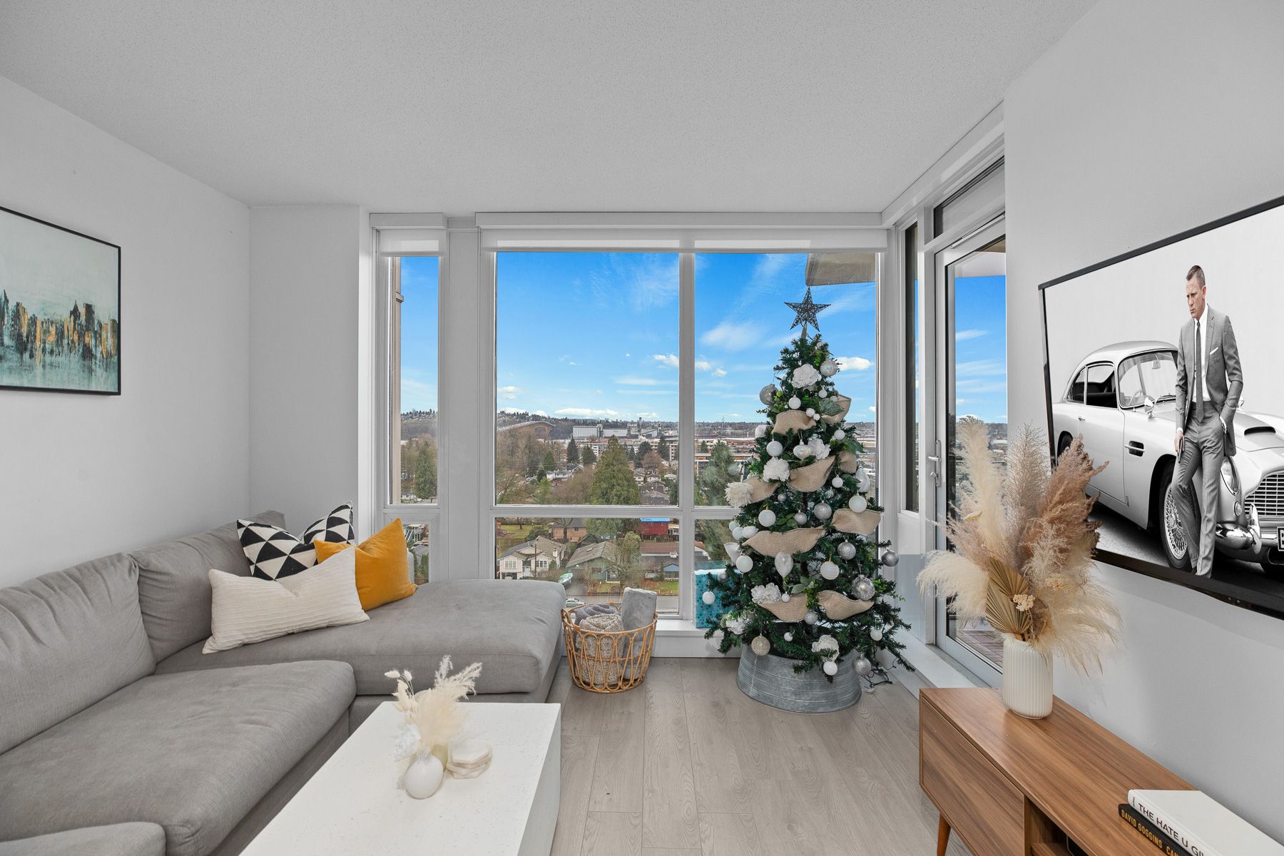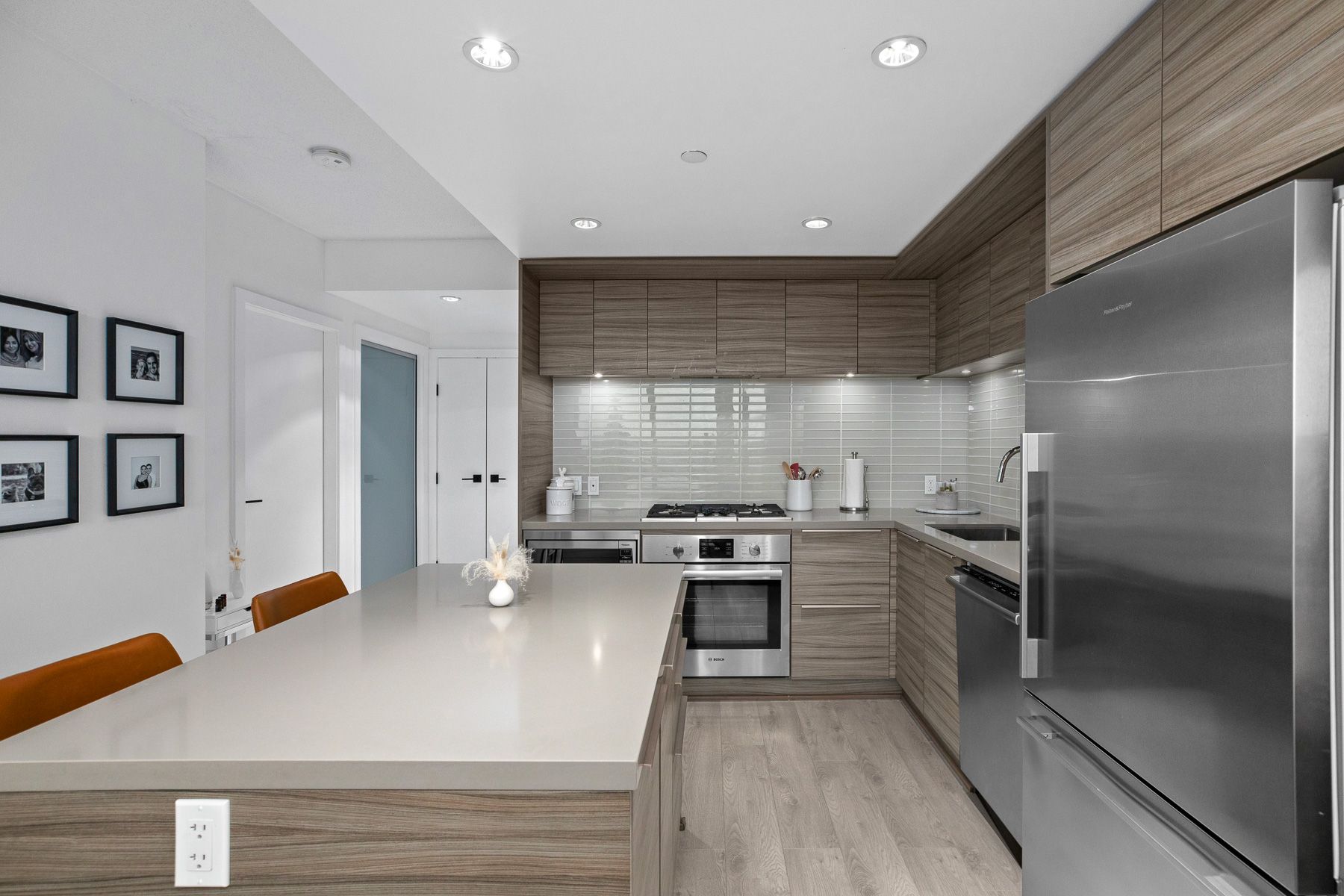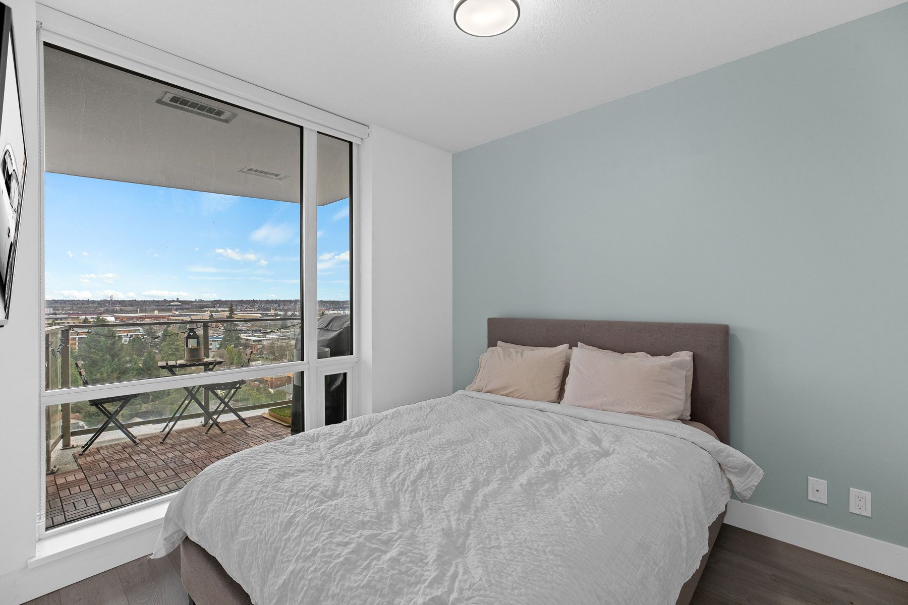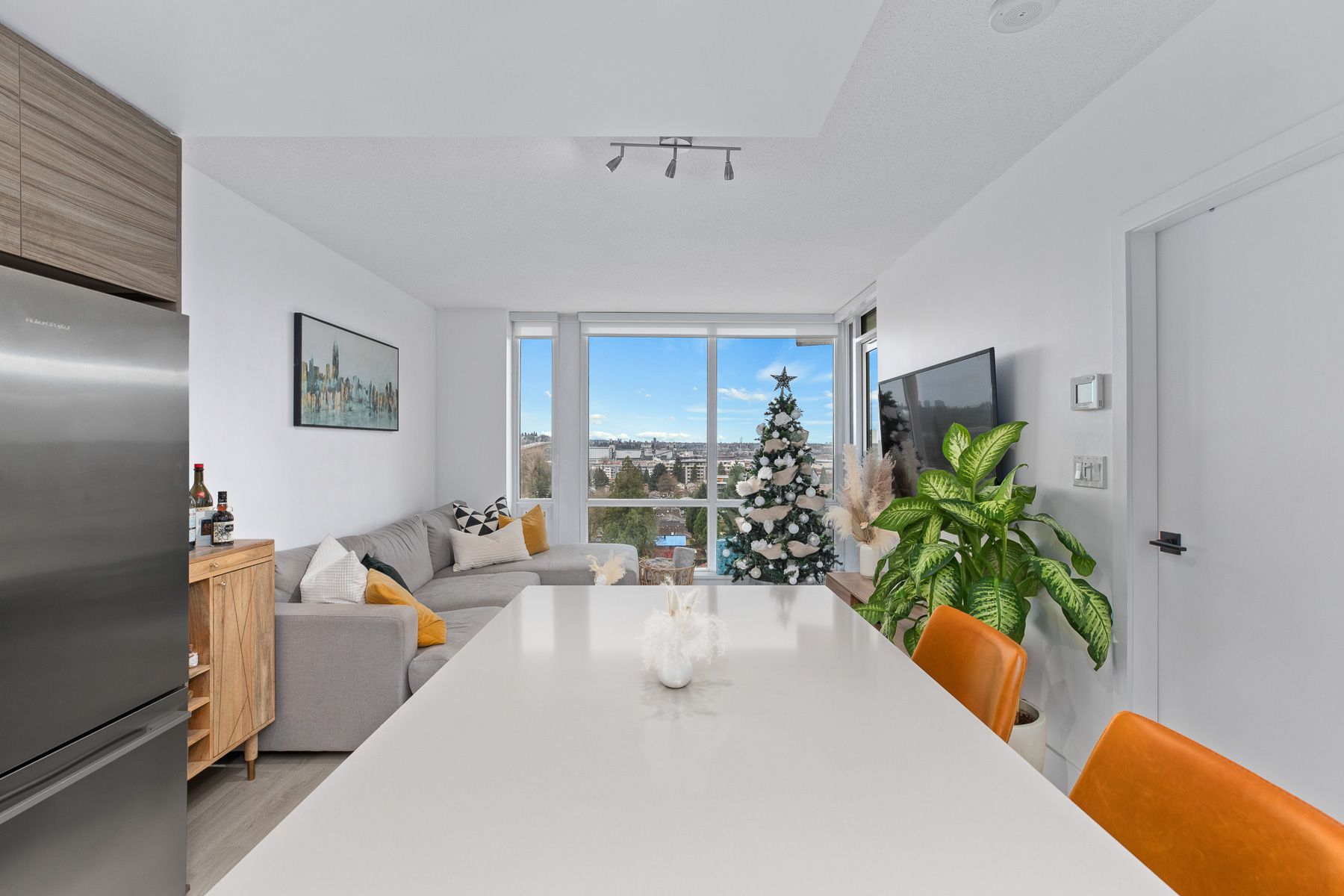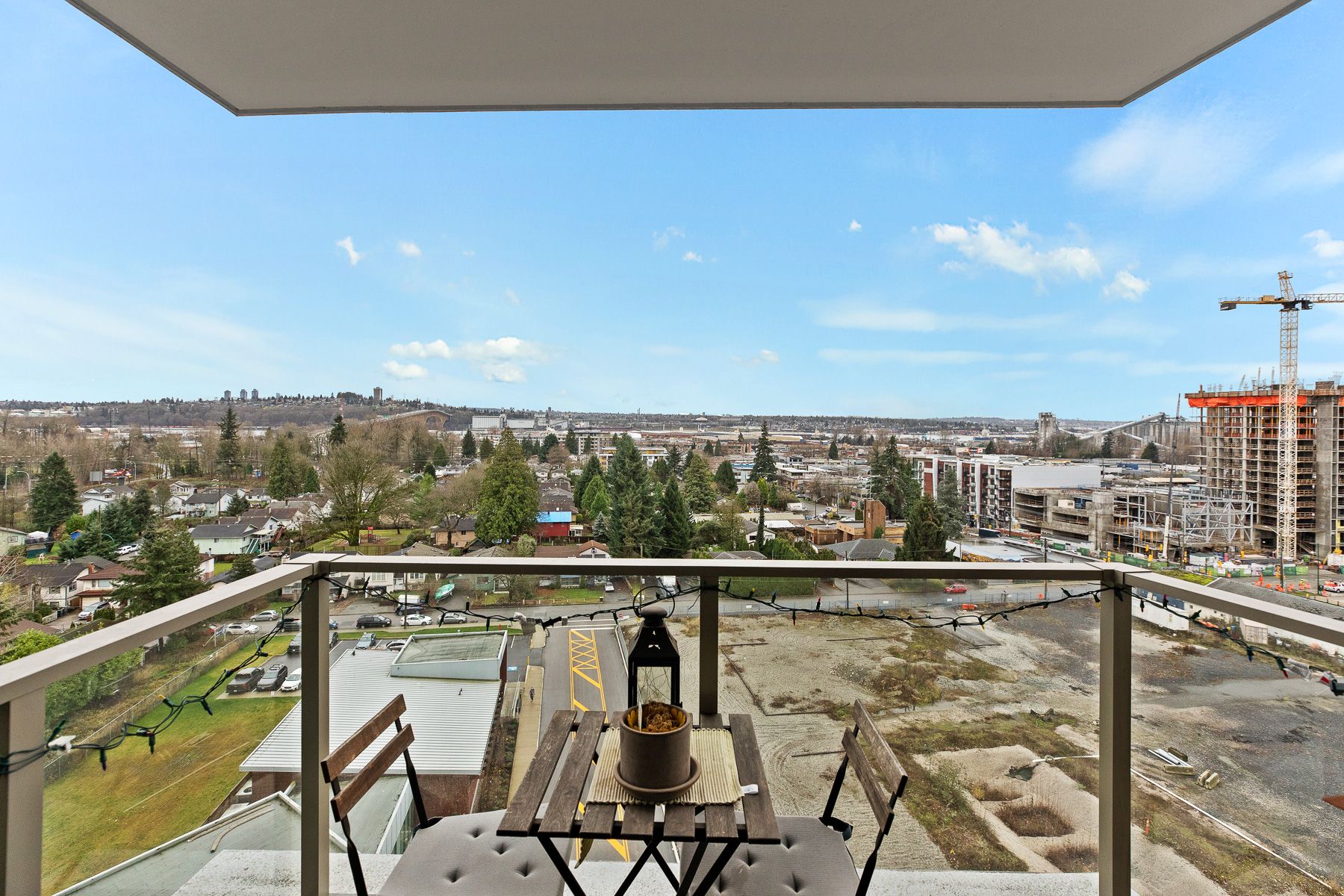 Step into this beautiful 1 bedroom and den, 1 bathroom 619sqft corner unit with city and mountain views! This spacious condo offers an open concept living space, plenty of cabinet storage and a spa-like bathroom. Enjoy high end finishes including stainless steel kitchen appliances, quartz countertops, floor to ceiling triple ply windows and new laminate flooring. Amazing 13,000sqft amenities centre that includes: health and fitness facility, 25M lap pool, lounge with a kitchen, spa, yoga, dance studio, sauna, steam room and guest suite.